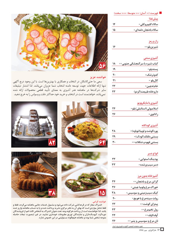 فهرست مجله هنر آشپزی 60 با 49 عنوان دستور تهیه